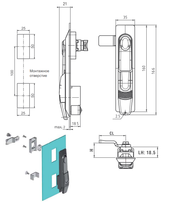Замок-ручка 306 от MESAN. Эргономная ручка. Подходит для правостороннего и левостороннего монтажа. Скользящая пылезащитная крышка. Возможно изготовление с проушиной под навесной замок.